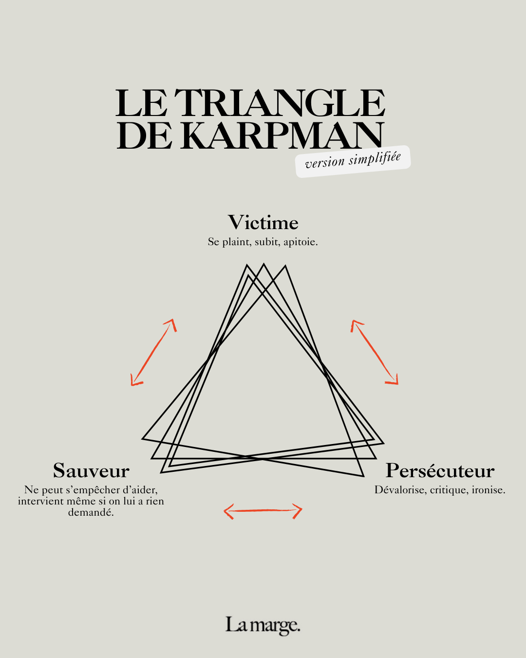 Ce schéma psychologique proposé par un médecin et psychiatre du nom de Stephen Karpman en 1968 met en évidence un scénario relationnel typique entre les différents rôles de Victime, Persécuteur et Sauveur. Adaptable à toutes les situations incluant une communication entre plusieurs individus (c’est à dire en quasi-permanence dans nos vies), il régit les règles de manipulation psychologique, souvent inconscientes, de nos relations.