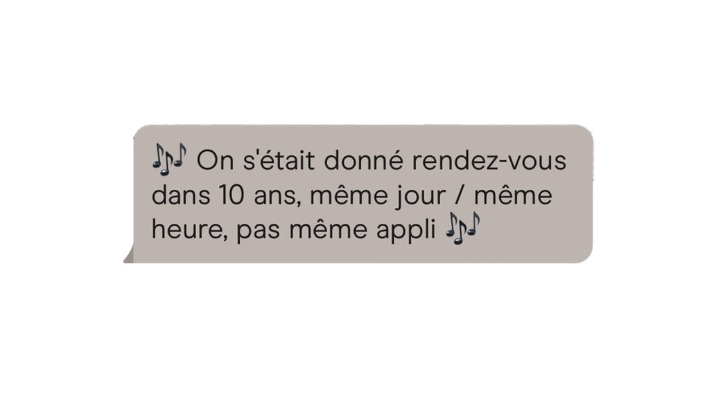 Enfile mes Birkenstock à moumoute deux secondes et dis-toi bien que pour ce retour d’acide-là, je n’étais absolument pas prête. L’énergumène en question avait totalement été évacué de mon cerveau par la grande porte depuis 2019. Mais un soir d’été, il a fait une entrée remarquée sur l’écran de mon téléphone comme une amende indésirable d’excès de vitesse sur ta voiture de loc’ de vacances dans ta boite aux lettres, à la rentrée. « On s’était dit rendez-vous dans 10 ans, même jour, même heure, pas même appli ». Le cu-lot.